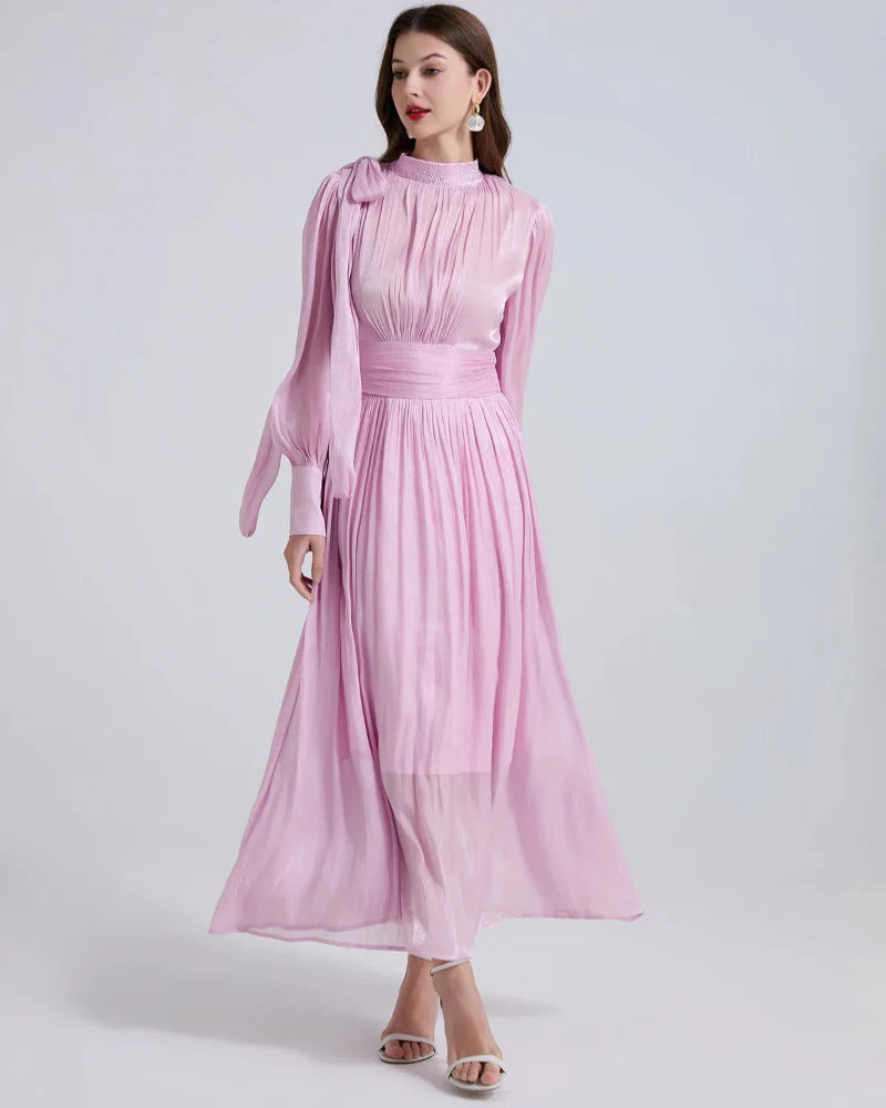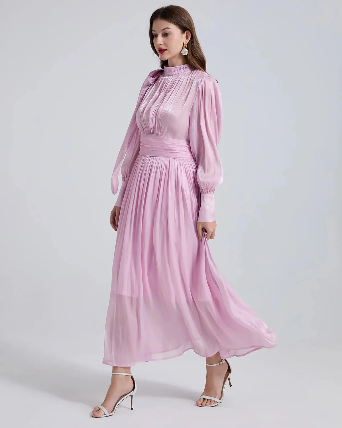 Vestido midi elegante de chiffon plissado com mangas compridas