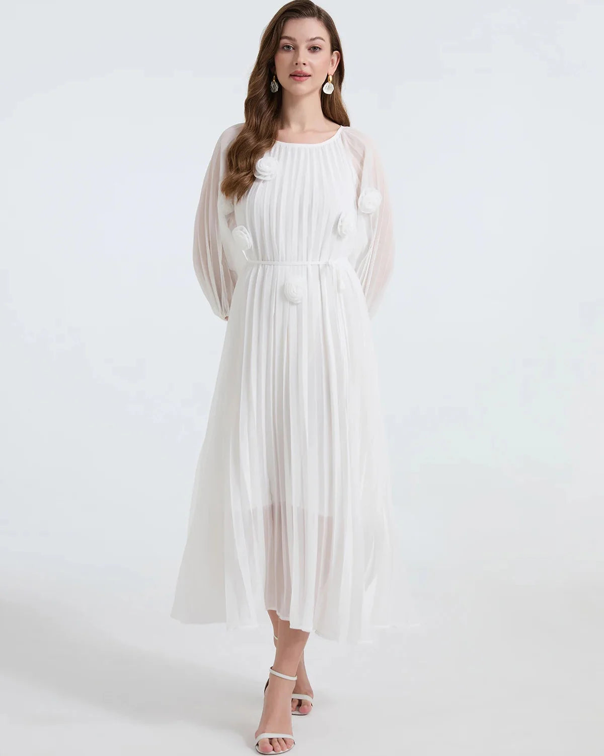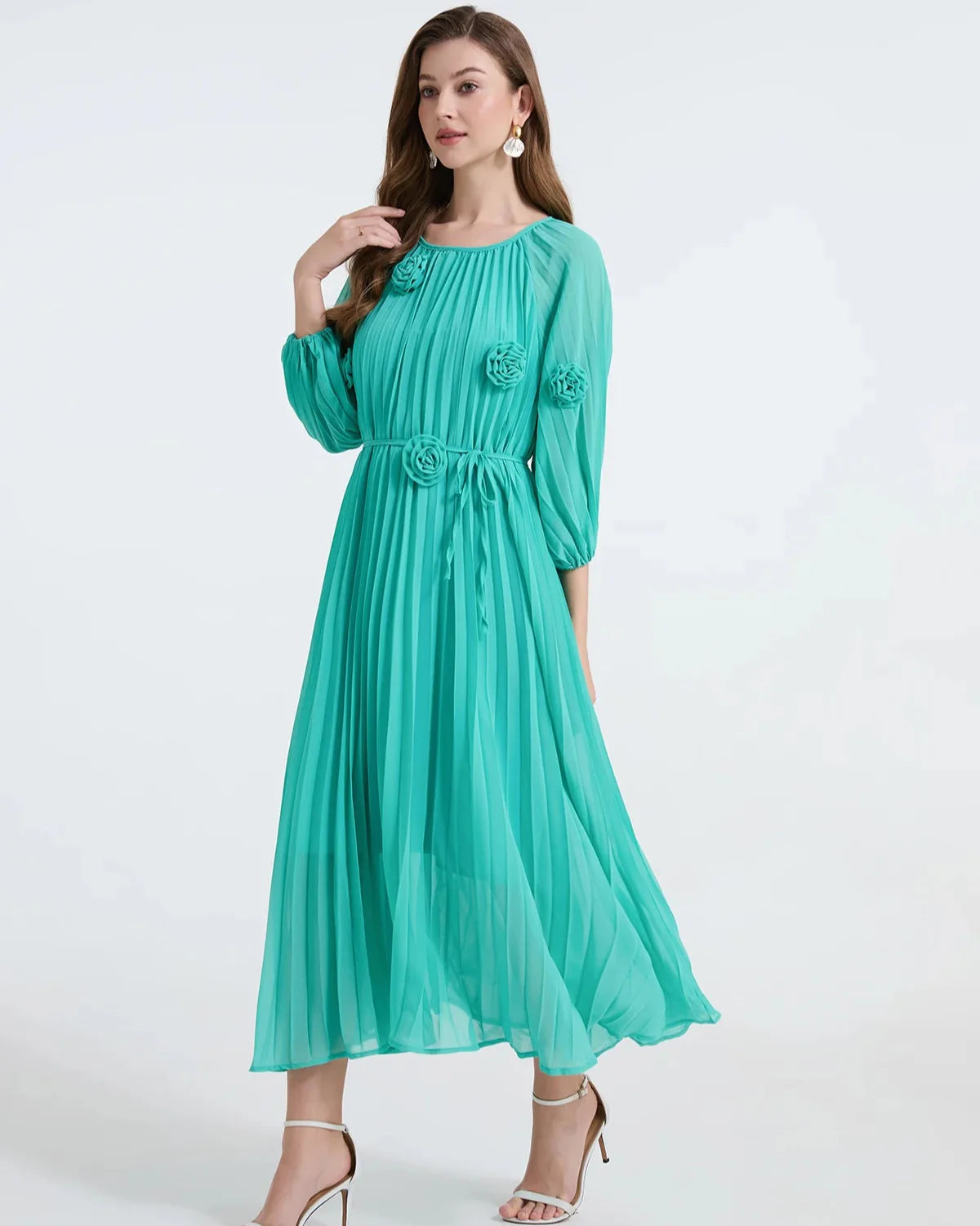 Confeccionado em chiffon leve, este vestido de comprimento midi apresenta pregas suaves que criam um movimento gracioso e uma silhueta elegante. O detalhe que se destaca? Lindas rosetas florais 3D costuradas à mão adornando o corpete e as mangas – um toque sofisticado que torna este vestido verdadeiramente único.