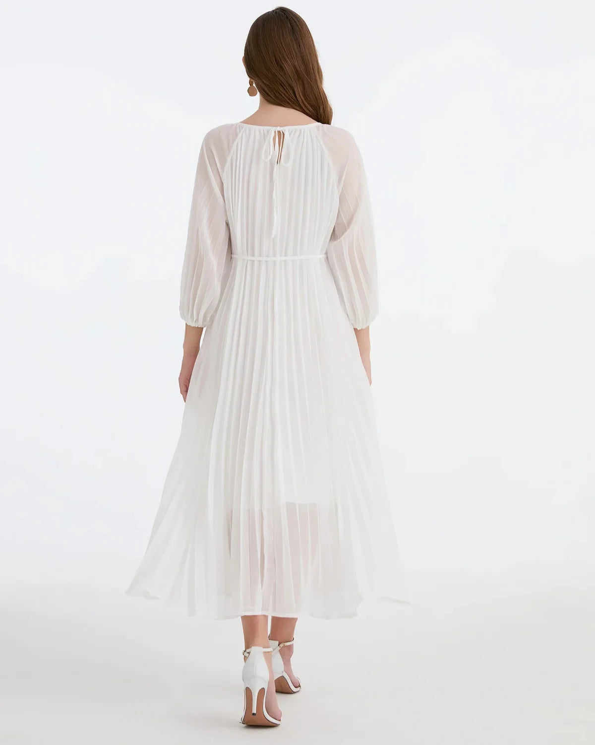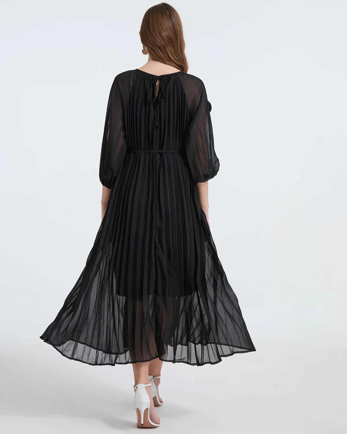 Adicione elegância atemporal ao seu guarda-roupa com nosso Vestido Midi Plissado com Mangas Transparentes e Apliques Florais 3D, criado exclusivamente para a mulher moderna. Este vestido é uma escolha deslumbrante para casamentos, festas diurnas e eventos noturnos elegantes.